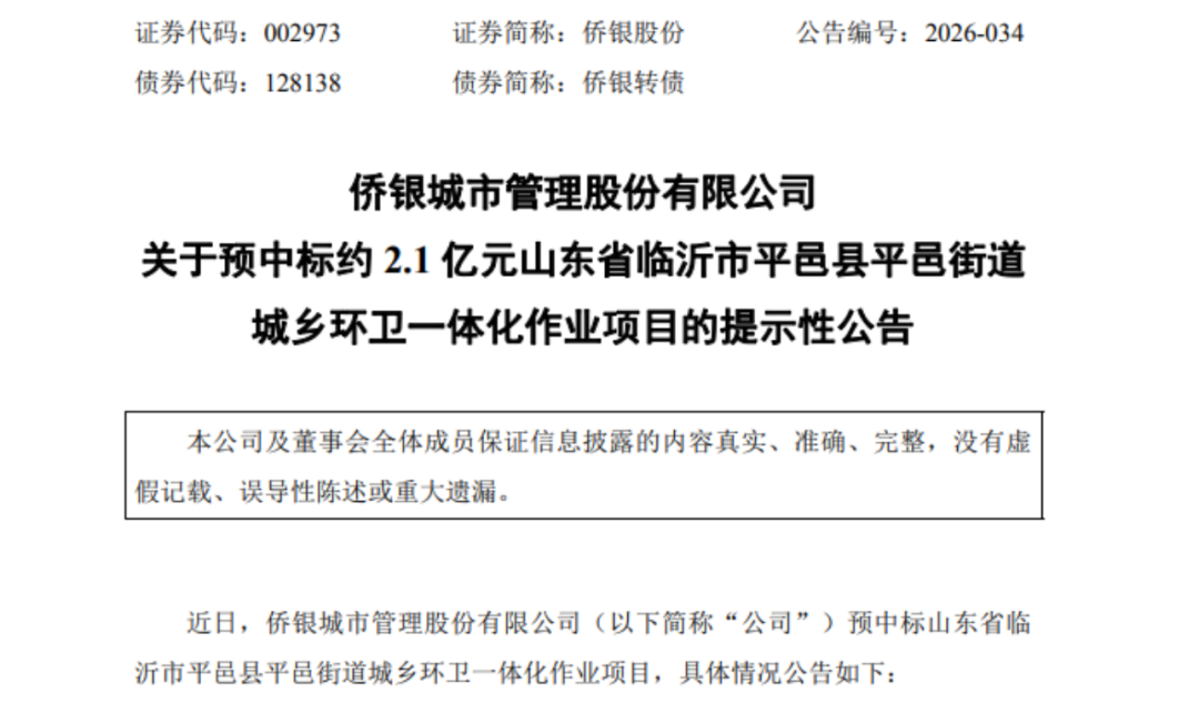环卫在线网讯移动配资交易平台,2026年3月16日,侨银城市市管理股份有限公司发布关于预中标约2.1亿元山东省临沂市平邑县平邑街道城乡环卫一体化作业项目的提示性公告,
